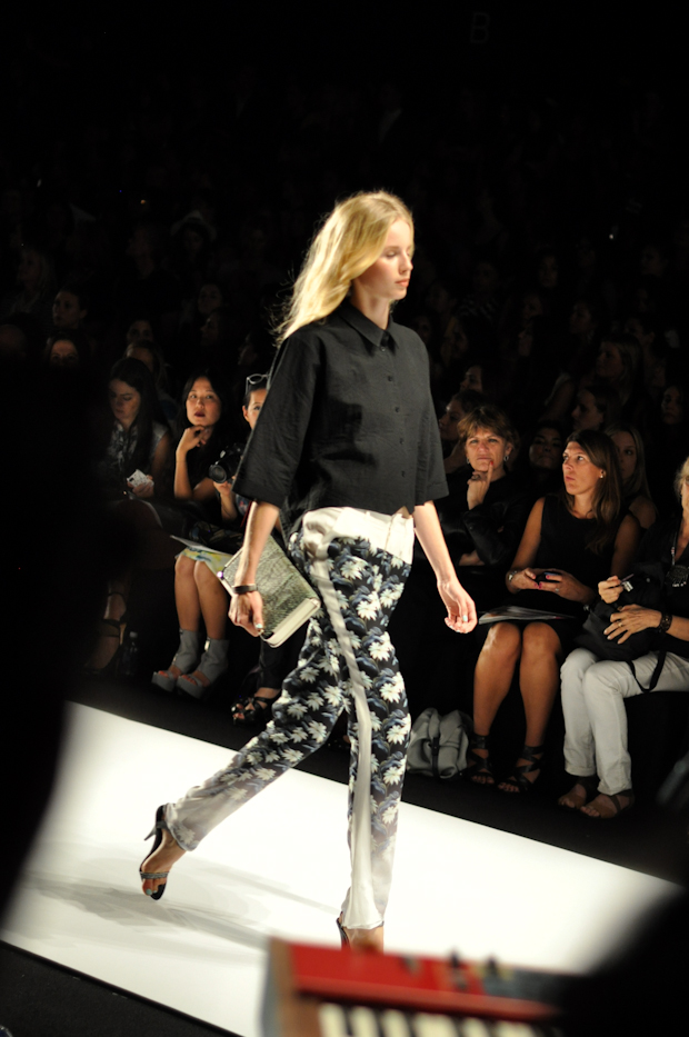 After my first experience at a Rebecca Minkoff show back in February, I knew I was in for a real treat again.  Runway action with an uplifting live musical performance (this time from DJ Cassidy and Tennis). The first look pictured above was definitely my favorite – loving the easy-slouchy vibe of the trousers!