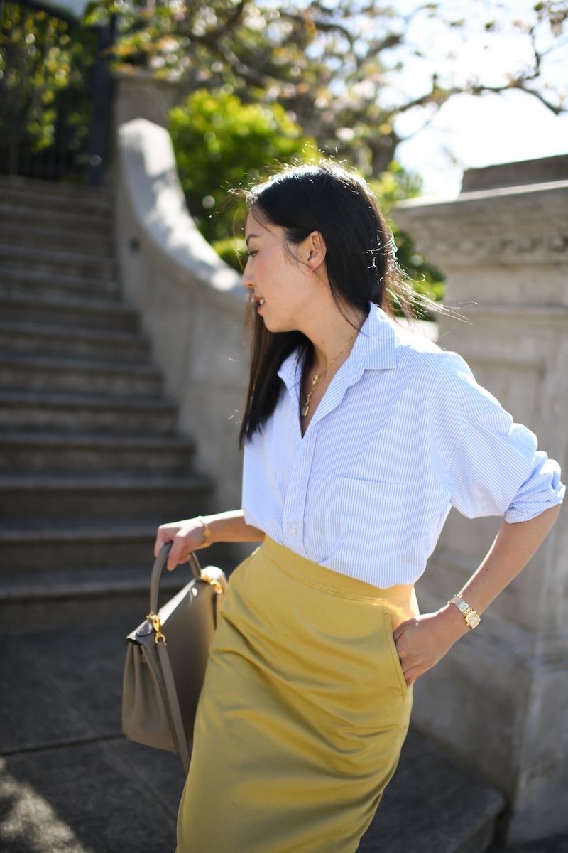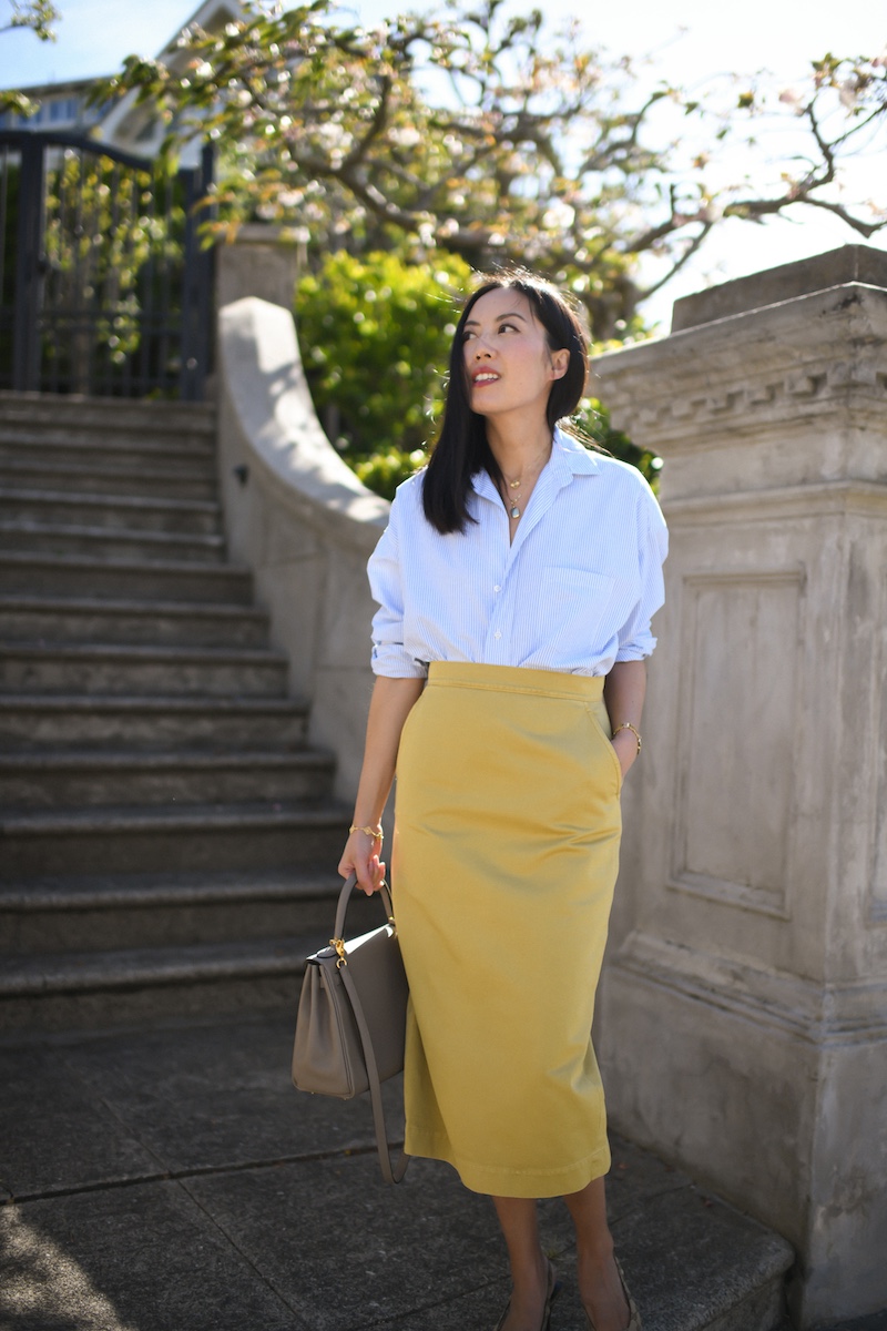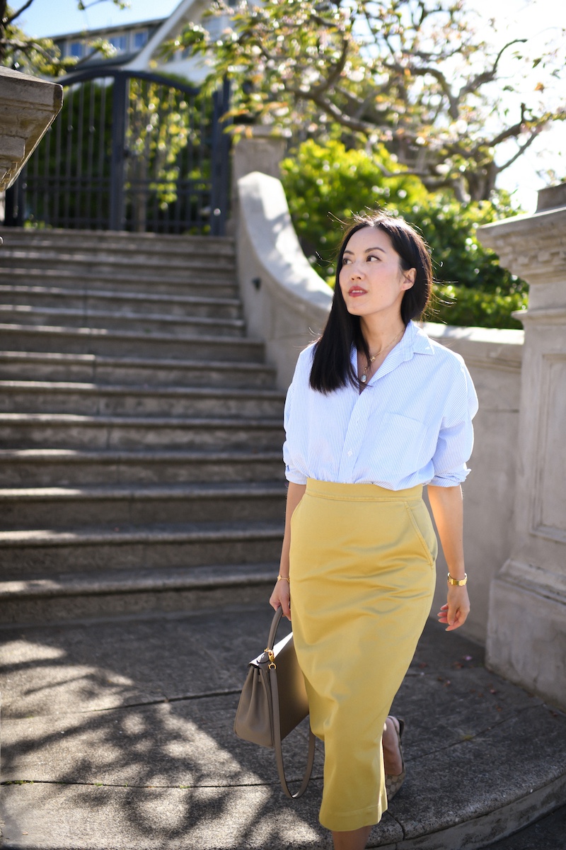 Fabrication dictates the vibe of an outfit, but so do the shapes. In this case, I paired a cotton twill pencil skirt with a cotton button-down shirt. Casual, but also, not. I like that tension!